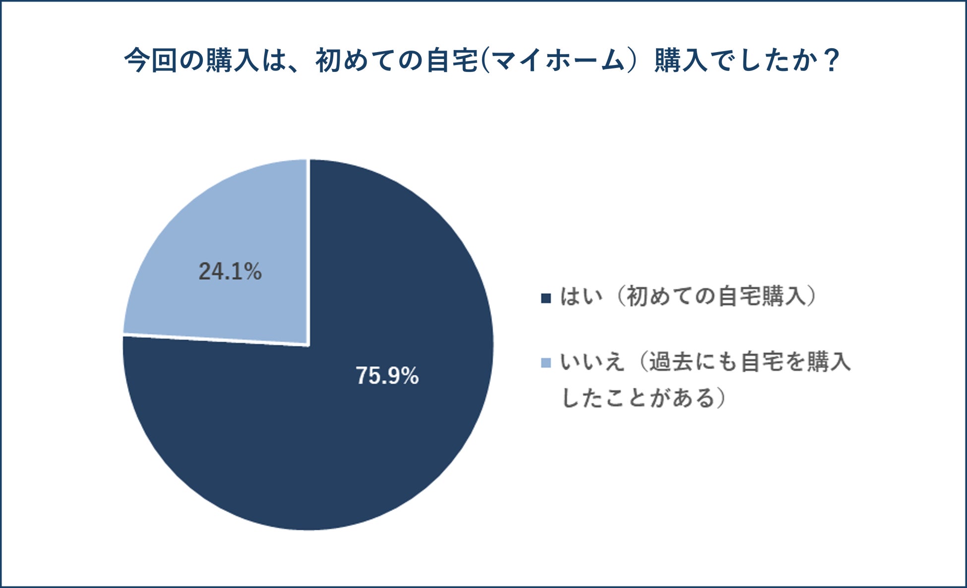 今回の購入は、初めての自宅購入かと聞いたところ、「はい(初めての自宅購入)」が75.9%、「いいえ(過去にも自宅を購入したことがある)」が24.1%という結果になりました。初めて自宅を購入する際でも75%以上の方が中古住宅を選択して購入したことがうかがえます。