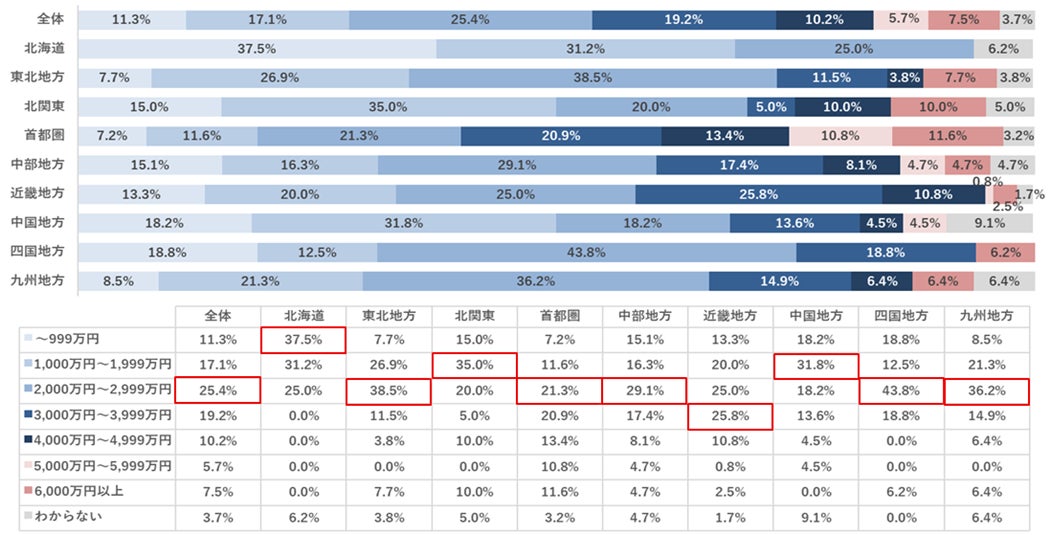北海道では、「1,000万円未満」が37.5%と最も多くなっており、「3,000万円以上」は0%となっています。北関東(茨城県・栃木県・群馬県)では、「1,000万円台」が35.0%と最も多く、一方で「6,000万円以上」も10.0%と全エリアの中では2番目に多い数値になっています。首都圏(東京都・埼玉県・千葉県・神奈川県)では、「2,000万円台」が21.3%と最も多く、一方で「4,000万円台」が13.4%、「5,000万円台」が10.8%、「6,000万円以上」が11.6%と「4,000万円台以上」の各金額帯で全エリアの中で最も多い数値になっています。近畿では「3,000万円台」が25.8%と最も多く、全エリアの中では近畿のみになっています。四国では、「2,000万円台」が43.8%と全エリアの中で最も多くなっています。このように各エリアによって状況が異なることが見て取れる結果になっています。