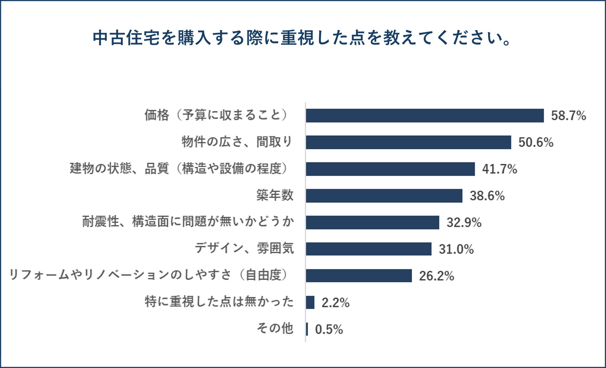 中古住宅を購入する際に重視した点を聞いたところ、「価格(予算に収まること)」が58.7%と最も多く、次いで「物件の広さ、間取り」が50.6%、「建物の状態、品質(構造や設備の程度)」が41.7%となっています。約60%の方が「価格(予算に収まること)」を重視している傾向がうかがえます。