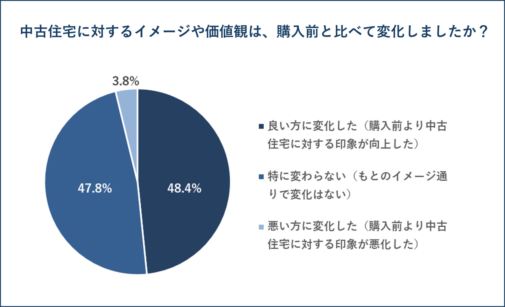 中古住宅に対するイメージや価値観が、購入前と比べて変化したかを聞いたところ、「良い方向に変化した(購入前より中古住宅に対する印象が向上した)」が48.4%、「特に変わらない(もとのイメージ通りで変化はない)」が47.8%、「悪い方に変化した(購入前より中古住宅に対する印象が悪化した)」が3.8%となっています。