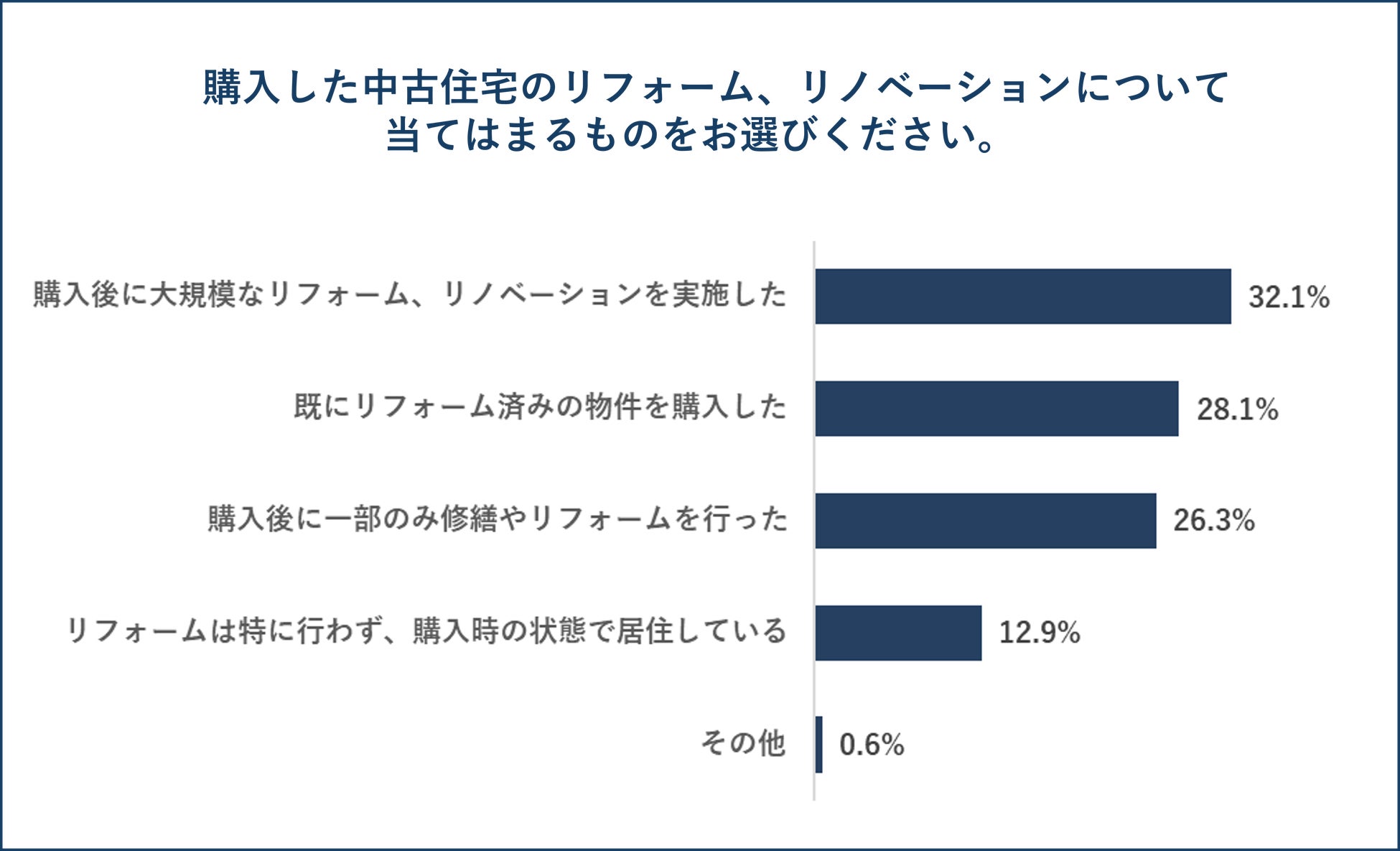 購入した中古住宅のリフォーム、リノベーションについて聞いたところ、「購入後に大規模なリフォーム、リノベーションを実施した」が32.1%、「既にリフォーム済みの物件を購入した」が28.1%、「購入後に一部のみ修繕やリフォームを行った」が26.3%となっています。