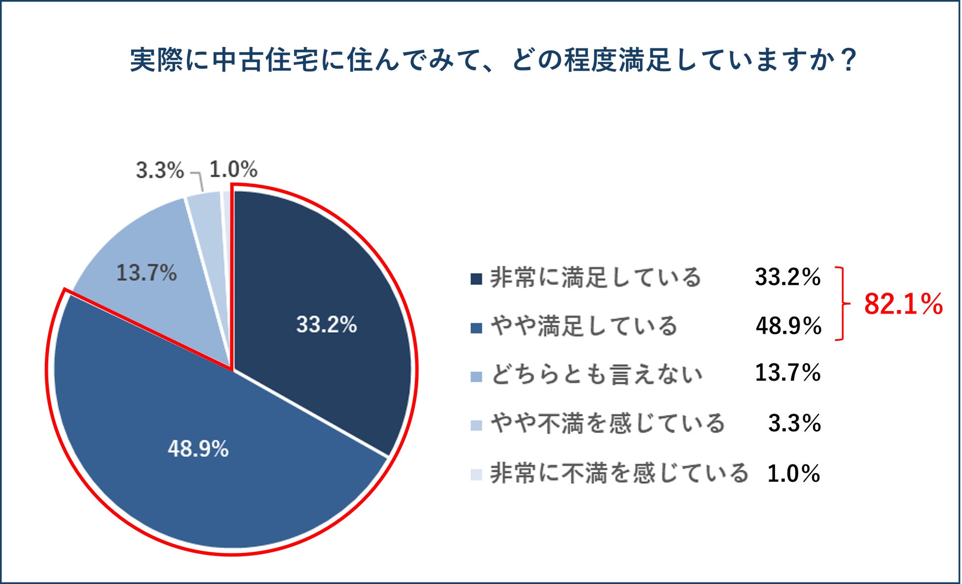 実際に中古住宅に住んでみて、どの程度満足しているか聞いたところ、「非常に満足している」が33.2%、「やや満足している」が48.9%となっています。「非常に満足している」と「やや満足している」を合計した「満足している」という合計は82.1%と高い数値になっています。