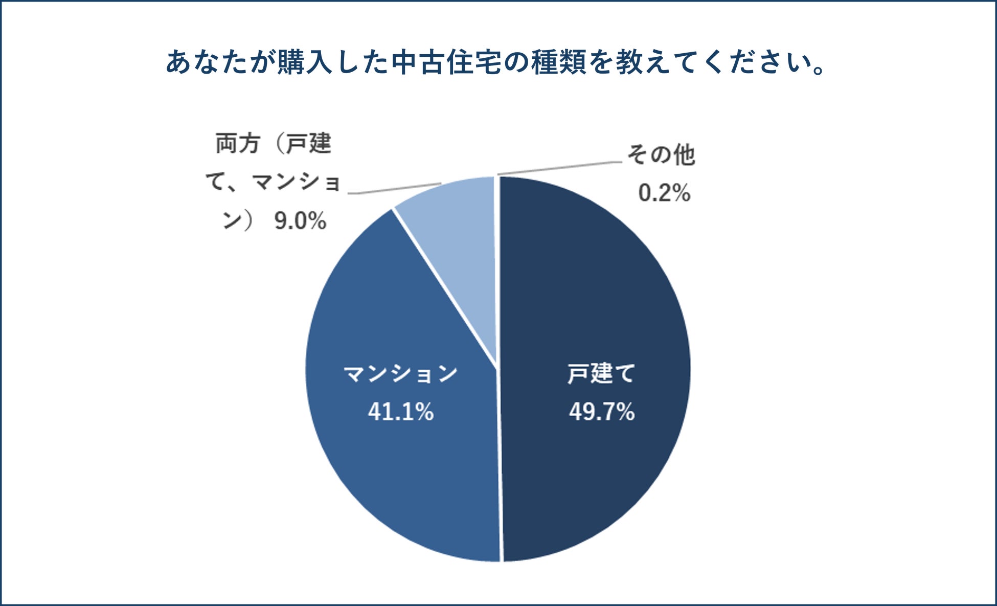 購入した中古住宅の種類を聞いたところ、「戸建て」が49.7%、「マンション」が41.1%という回答で、やや「戸建て」が多い結果になっています。また、「両方(戸建て、マンション)」を購入したという回答が9.0%ありました。