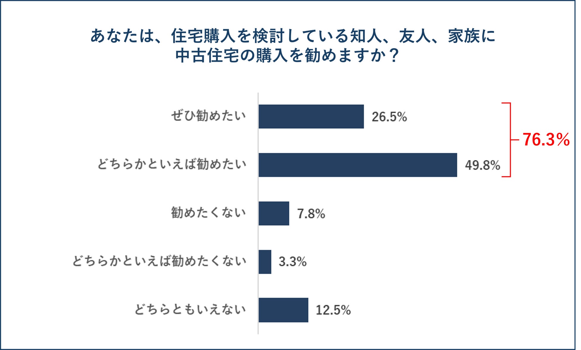 住宅購入を検討している知人、友人、家族に中古住宅の購入を勧めるかと聞いたところ、「ぜひ勧めたい」が26.5%、「どちらかといえば勧めたい」が49.8%と「勧めたい」という回答が76.3%となっています。