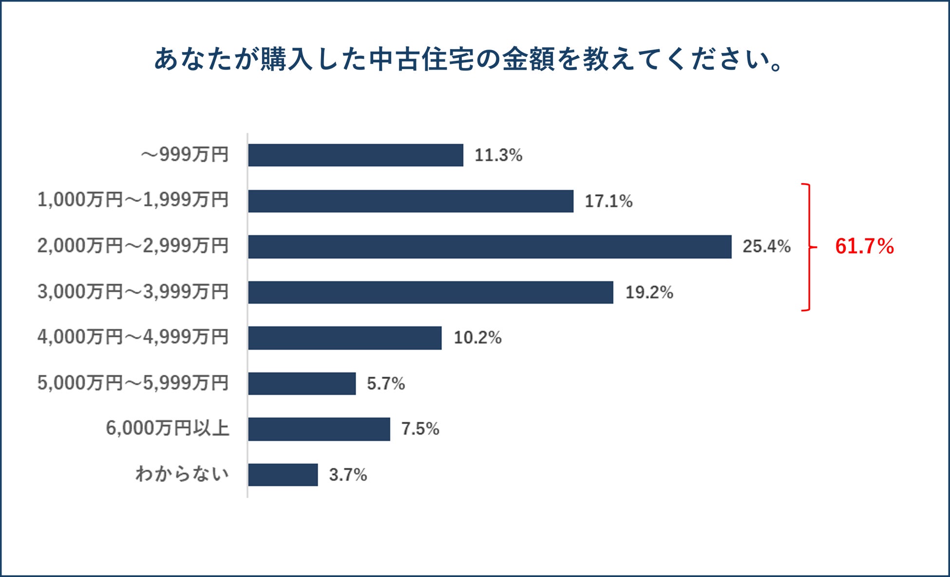 購入した中古住宅の金額を聞いたところ、「2,000万円台」が25.4%で最も多く、「3,000万円台」が19.2%、「1,000万円台」が17.1%となっています。また「1,000万円未満」が11.3%、「4,000万円台」が10.2%、「5,000万円台」が5.7%、「6,000万円以上」が7.5%となっており、「1,000万円台から3,000万円台」という回答の合計が61.7%と60%を超える結果になっています。これを、エリアごとに集計したものを見てみますと、以下のようになります。