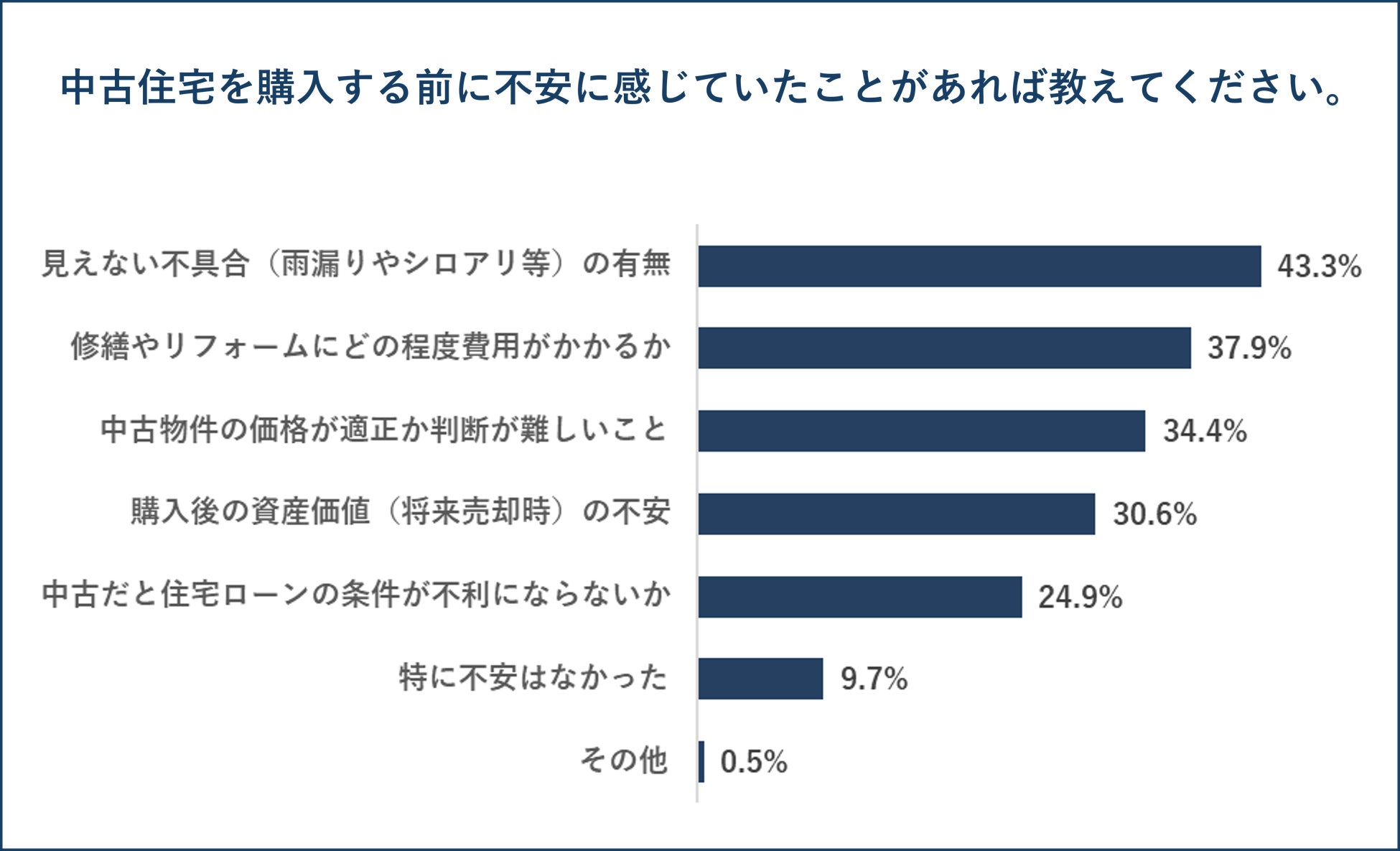 中古住宅を購入する前に不安を感じたことを聞いたところ、「見えない不具合(雨漏りやシロアリ等)の有無」が43.3%と最も多く、「修繕やリフォームにどの程度費用がかかるか」が37.9%、「中古物件の価格が適正か判断が難しいこと」が34.4%となっています。
