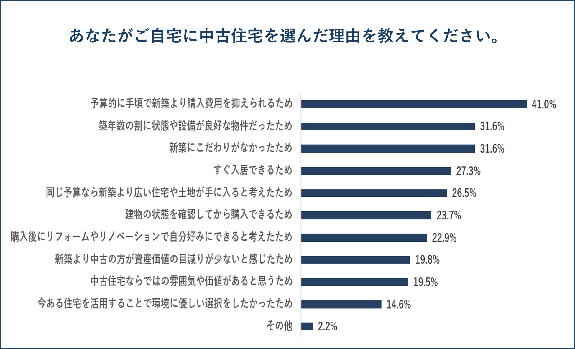 自宅に中古住宅を選んだ理由を聞いたところ、「予算的に手頃で新築より購入費用を抑えられるため」が41.0%と最も多く、「築年数の割に状態や設備が良好な物件だったため」と「新築にこだわりがなかったため」が共に31.6%となっています。上位の回答は“費用”や“設備面”など、住宅を選ぶ優先順位が新築という事より、費用面や築年数の割に状態や設備が良好だったなど、“実質的な条件面”の優先度が高い傾向がうかがえ、「新築にこだわりがない」という回答も30%を超える結果になっています。