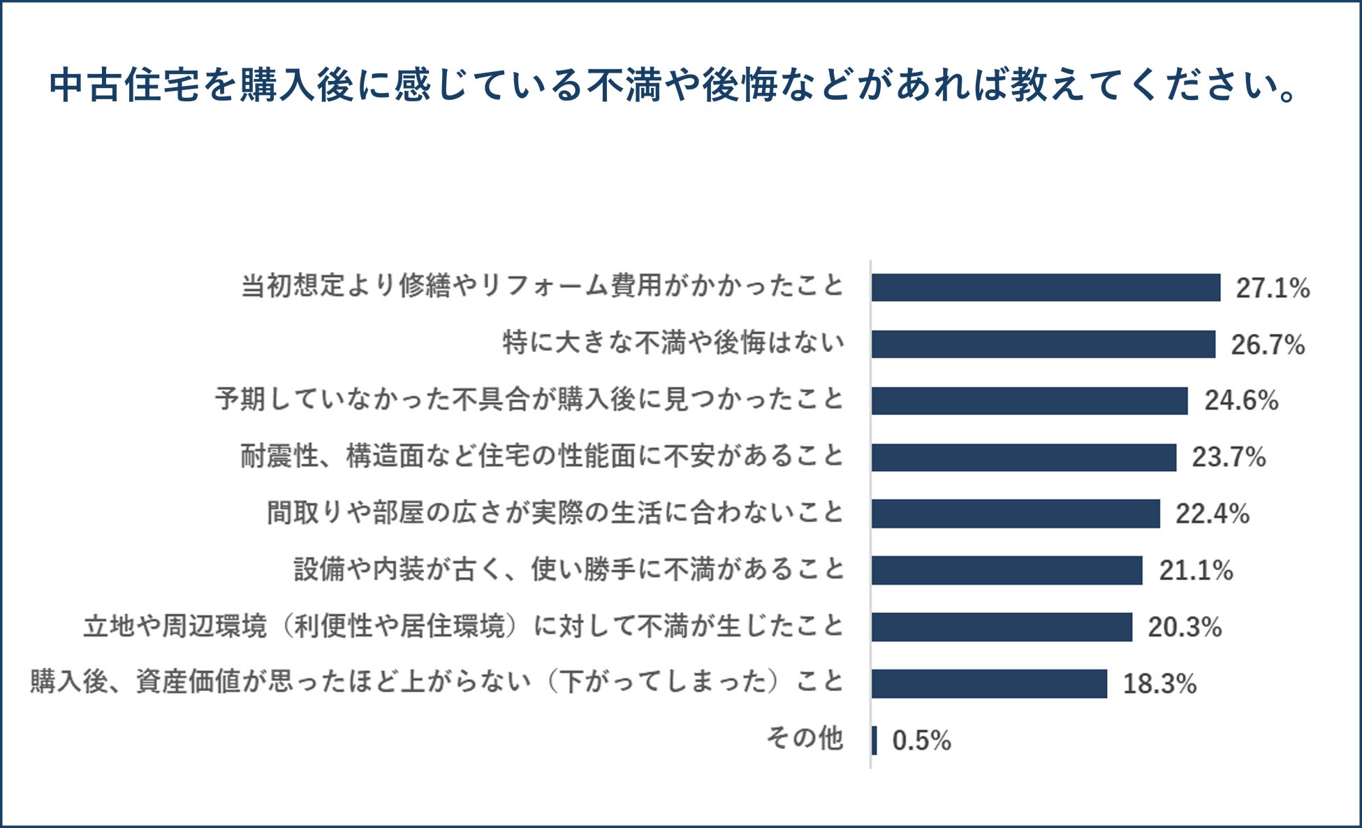 中古住宅を購入後に感じている不満や後悔などを聞いたところ、「当初想定よりリフォーム費用がかかったこと」が27.1%と最も多く、次いで「特に大きな不満や後悔はない」が26.7%、「予期していなかった不具合が購入後に見つかったこと」が24.6%となっています。