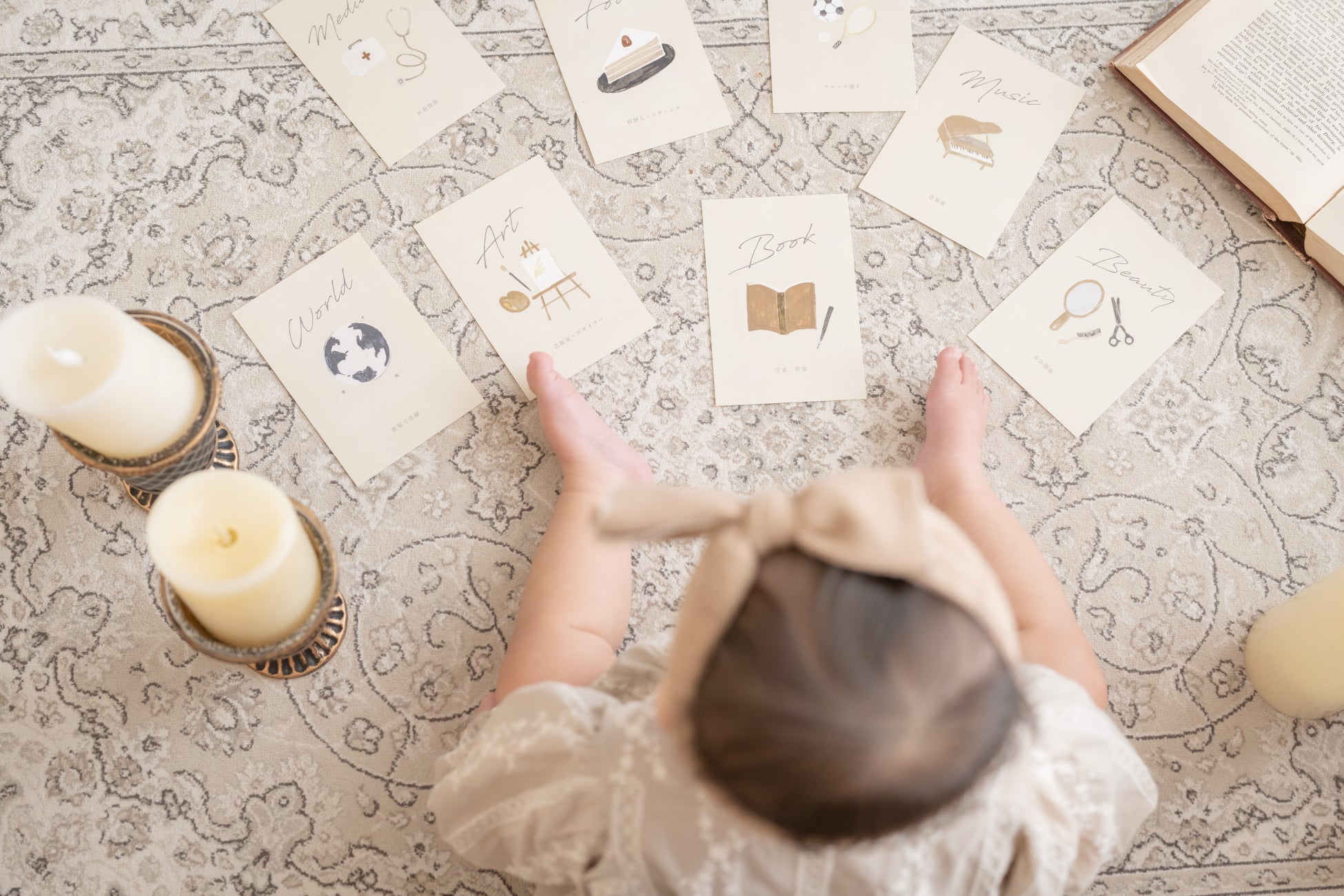 また、1歳の誕生日の行事として親しまれている「選び取り」では、コフレオリジナルの「選び取りカード」をご用意しており、選んだカードと手足型を一緒にディスプレイできる台紙プレゼントが人気の撮影メニューの一つです。