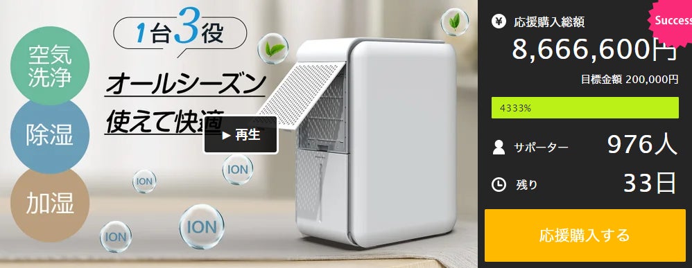 絶妙な湿度コントロールと空気浄化を実現する除加湿空気清浄機がクラウドファンディングで目標金額866万円を達成!