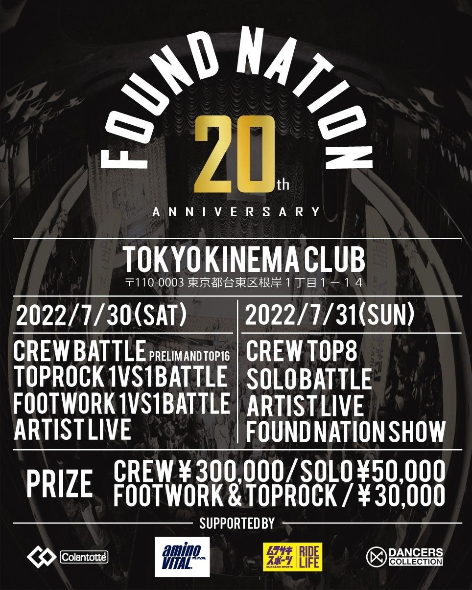 2002年の結成以来、世界大会FREESTYLE SESSION優勝、Red Bull BC One優勝など、ダンスシーン内外で常に日本のブレイキンシーンを牽引し続けているブレイクダンスチーム「FOUND NATION」は、今年2022年の結成20周年を記念するイベント『FN JAM 2022 - FOUND NATION 20TH ANNIVERSARY -』を、7月30日(土)~7月31日(日)、東京都台東区の「東京キネマ倶楽部」にて開催する。