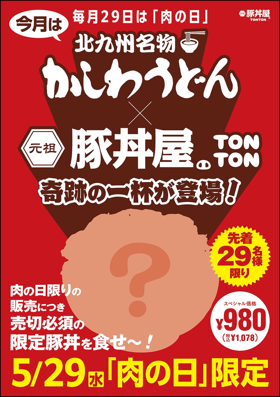 5月29日(水)は4月に好評いただいた北九州名物かしわうどんとのコラボ限定メニューを先着29名さま限りで提供いたします。売切必須の限定豚丼をどうぞ!