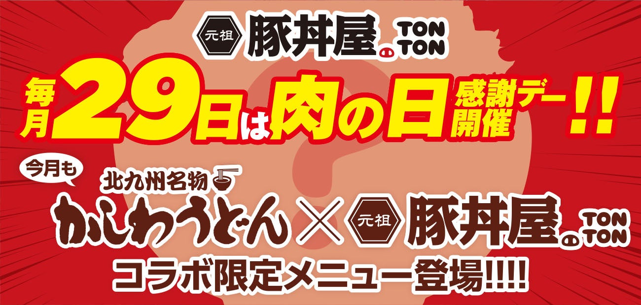 ワンズトライン株式会社(本社:大阪市北区芝田2丁目3番16号、代表取締役:山内仁)が運営する、北海道・帯広伝統の豚丼が人気の「元祖豚丼屋TONTON」では、毎月29日に肉の日感謝デーを実施します!