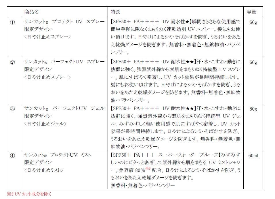 日やけ止めスプレー累計売上第1位※1のブランドを代表する商品「プロテクトUV スプレー」と「パーフェクトUV スプレー」は、身体だけでなく髪にも使える日やけ止めスプレーです。塗りにくい場所にも簡単に塗布することができ、外出先での塗り直しにも便利です。「プロテクトUV スプレー」はさらさら軽やかな使用感でありながら肌にしっかり密着し、紫外線ダメージから肌をまもります。「パーフェクトUV スプレー」は、海などのレジャーシーンでもお使いいただける耐久性に優れた日やけ止めスプレーです。「パーフェクトUV ジェル」は、みずみずしい軽い使用感が特長で汗・水・こすれにも強い持続型UVジェルです。「プロテクトUV ミスト」はレチノール誘導体S※2を配合した美容液80%※3配合で素肌のようにベタつきのない使用感が特長です。