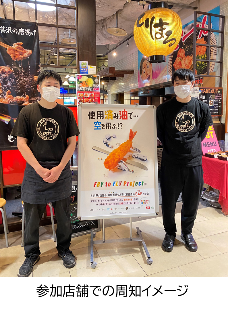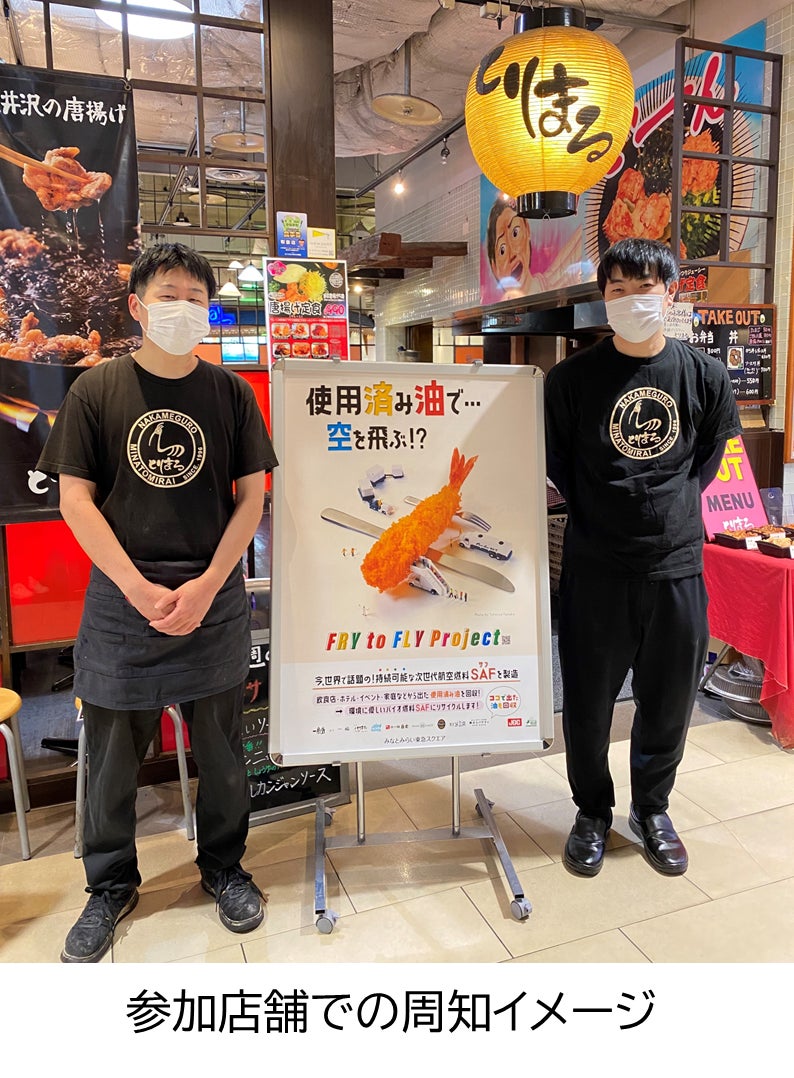 ※2「FRY to FLY Project」はご家庭や店舗などで発生する廃食用油という国内資源を原料とするSAFで、航空機が飛ぶ世界を実現するプロジェクトです。SAFが本格的に導入される為には多くの廃食用油が必要となりますが、現在、家庭の廃食用油の多くは廃棄されており、回収された廃食用油についても年間10万トン以上が国外に輸出されているといわれています。 設立主旨に賛同する参加企業・自治体・団体が相互に連携しつつ、家庭や店舗などから排出される廃食用油の収集を促進するとともに、自治体との連携により廃食用油のSAF への活用に関する教育活動を実施するなど、日本国内において脱炭素化に向けた資源循環の促進に積極的に参加できる機会の創出を目指しています。