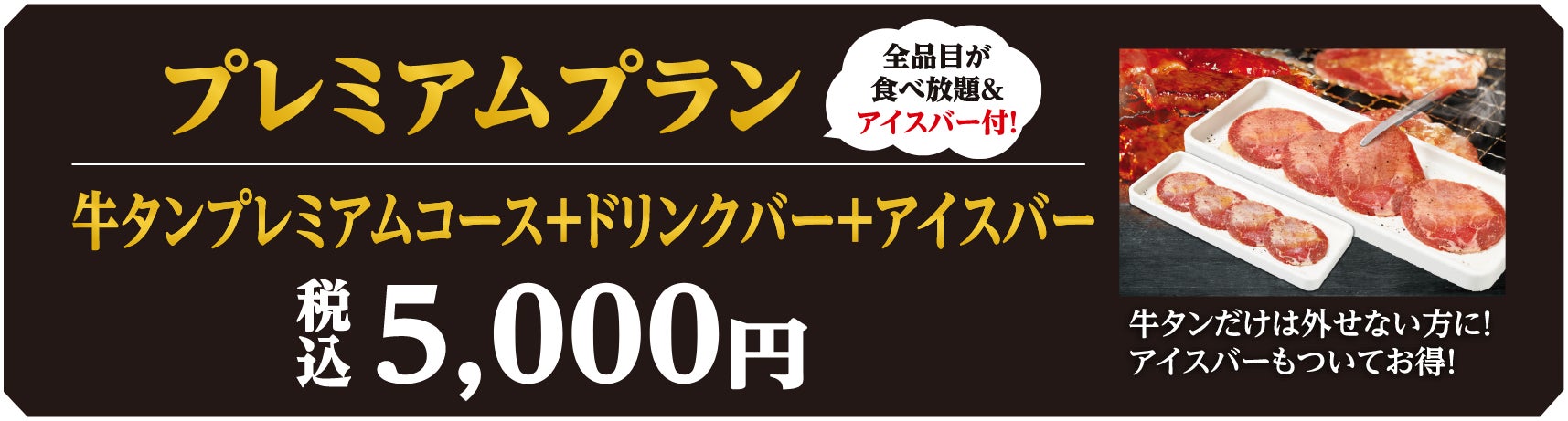 3.プレミアムプラン:5,000円(牛タンプレミアムコース+ドリンクバー+アイスバー)