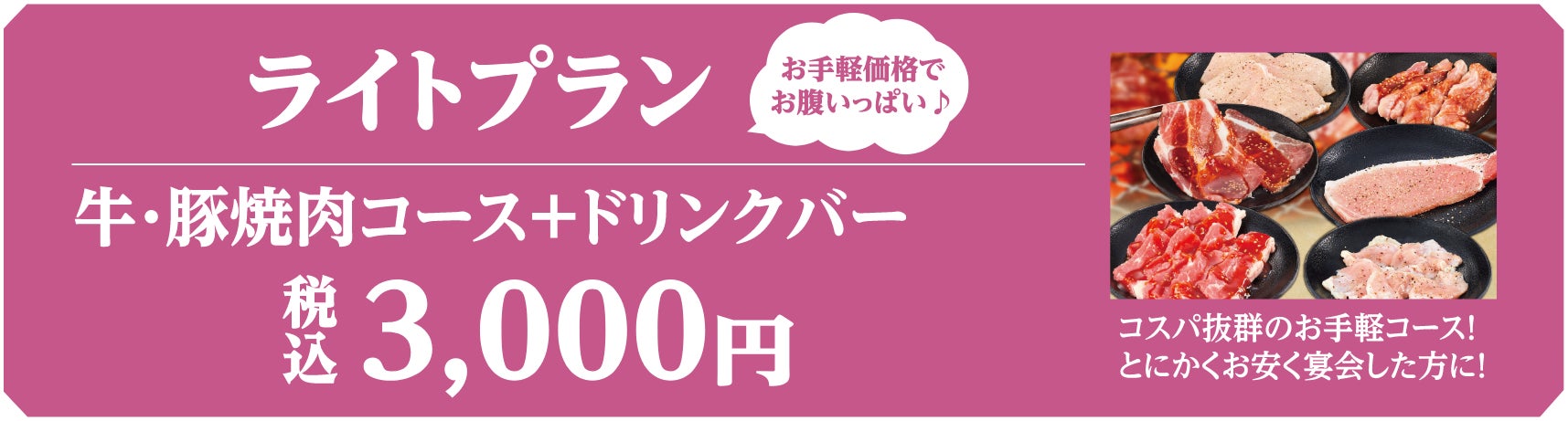 1.ライトプラン:3,000円(牛・豚焼肉コース+ドリンクバー)
