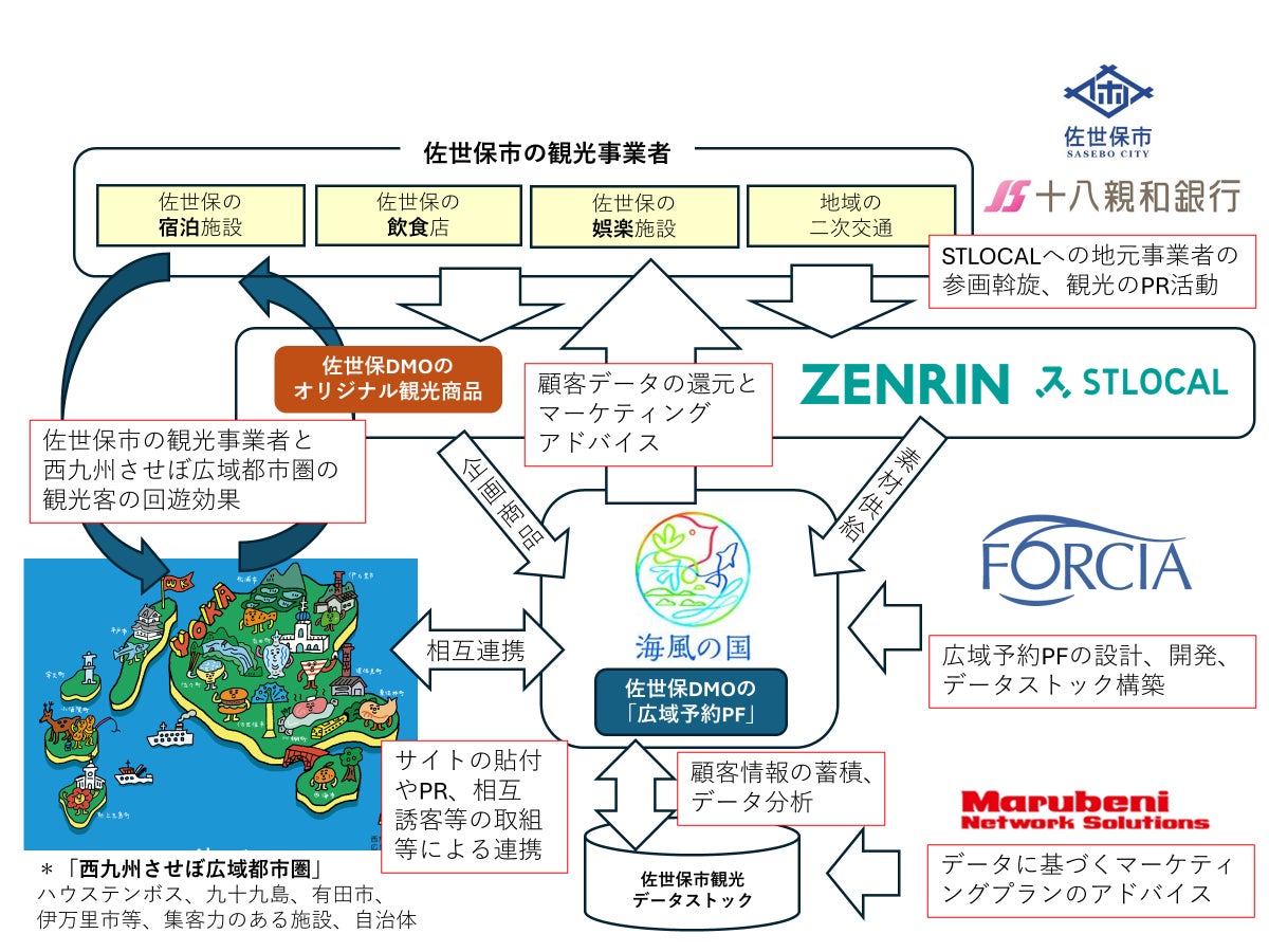 公益財団法人佐世保観光コンベンション協会(本部:長崎県佐世保市、理事長:辻 宏成、以下 佐世保DMO)、株式会社ゼンリン(本社:福岡県北九州市、代表取締役社長:髙山 善司)、株式会社十八親和銀行(本社:長崎県長崎市、取締役頭取:山川 信彦)、フォルシア株式会社(本社:東京都新宿区、代表取締役社長:屋代 浩子)、丸紅ネットワークソリューションズ株式会社(本社:東京都文京区、代表取締役社長:長尾 頼明)は共同で、佐世保を中心とした西九州地区の観光事業の活性化に向けたDXの取組をレベルアップすることを目的に、観光庁が公募した実証事業「全国の観光地・観光産業における観光DX推進に関するマーケティング強化モデル実証事業」に採択され、事業推進を担うコンソーシアム「海風の国DXマーケティングコンソーシアム」を2024年7月5日(金)に設立しました。