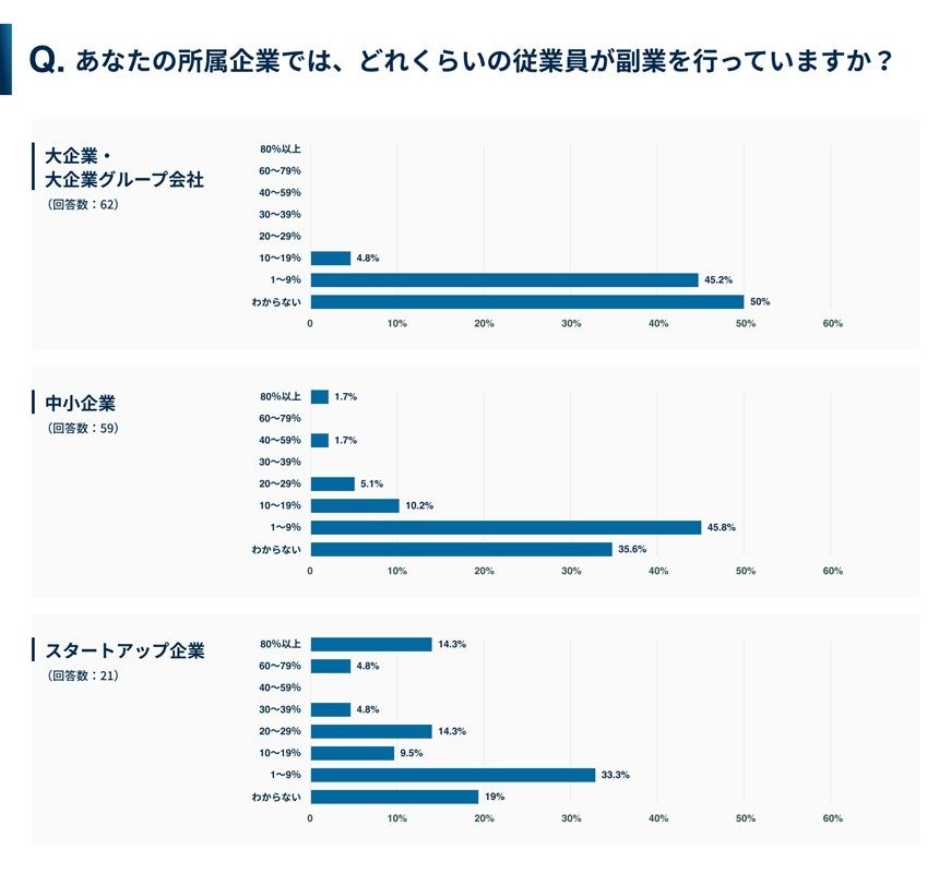 「あなたの所属企業では、どれくらいの従業員が副業を行っていますか?」と尋ねたところ、大企業では「1~9%」が45.2%でした。中小企業では「1~9%」が45.8%、スタートアップでは「1~9%」が33.3%、次いで「20~29%」が14.3%でしたが、80%以上の副業者がいるという回答も14.3%となりました。このことから、副業元年〜コロナ流行以降に副業を認める会社が多くなった一方で、特に大企業と中小企業では、副業制度の社内浸透など、実態としての副業推進はこれからであることが分かります。