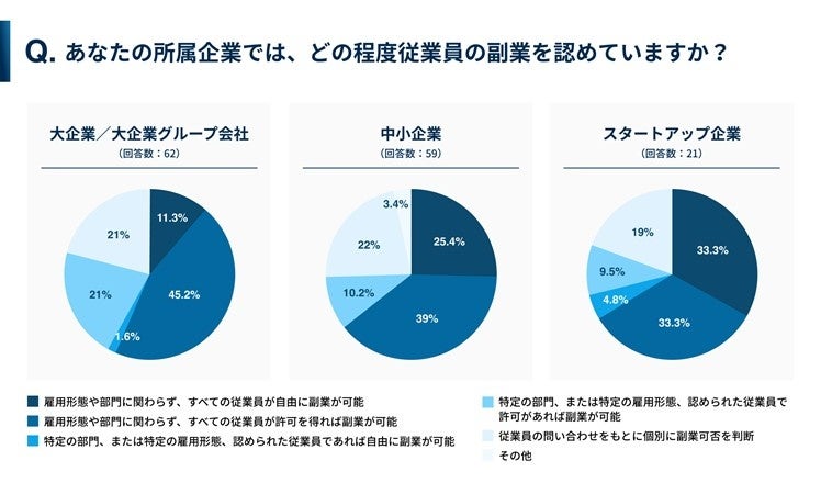 「あなたの所属企業では、どの程度従業員の副業を認めていますか?」という質問に対し、大企業・中小企業・スタートアップ、全てにおいて「雇用形態や部門に関わらず、すべての従業員が許可を得れば副業が可能」の回答が最も多い結果となりました。また、スタートアップでは、「雇用形態や部門に関わらず、すべての従業員が自由に副業が可能」との回答も、同じく33.3%となり、許可を得ずとも副業ができるケースもあるようです。