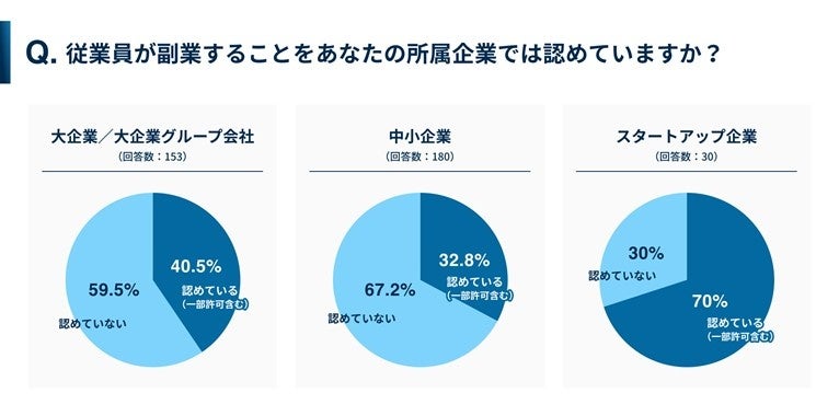 ✓副業が認められている割合は、スタートアップが最も高く、大企業も4割が許可