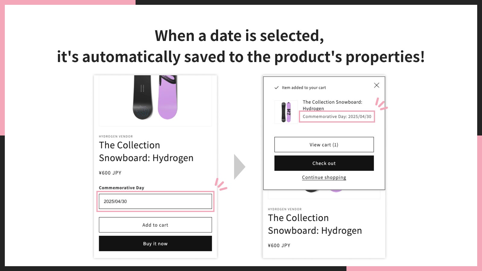 お客様が入力した日付は、注文に紐付けられる形で自動的に商品プロパティへ保存されます。これにより、ストア側は入力内容を管理しやすくなり、手入力によるミスや確認漏れを防ぐことができます。
