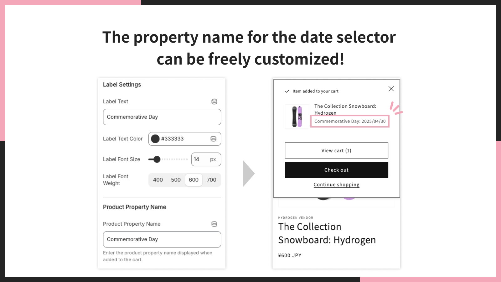 カートや注文履歴に表示される日付項目の名称は、ストアの運用方針に合わせて自由に設定できます。たとえば、「記念日」「納品希望日」など、商品やサービスに応じた適切なプロパティ名を設定することで、顧客にもわかりやすく伝えられます。