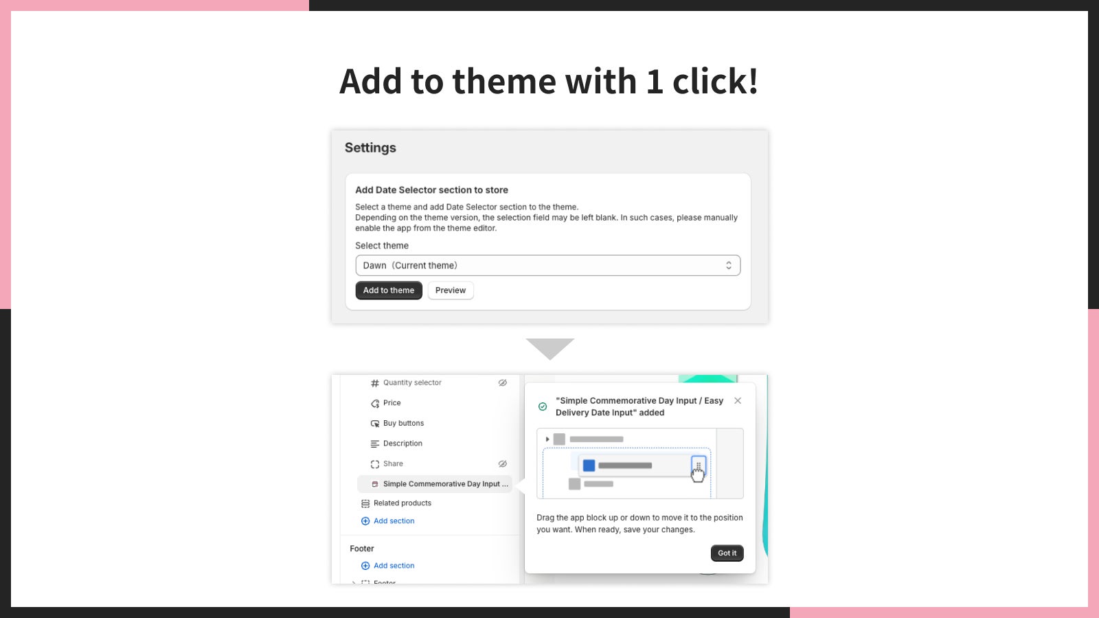 複雑なコーディング作業は一切不要。設定画面からワンクリックでテーマに反映できるので、導入もスピーディです。誰でも簡単に、すぐにカレンダー機能を活用したストア運営をスタートできます。