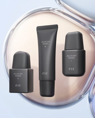 「エスト ジェリオロジー プライマー」最大の特長は、95%以上が水分からなるクラゲに着想した、まるでパックのように肌をおおう「ジェリオロジー ヴェール」。ぷるんとやわらかな膜が漂うように肌に寄り添うことで、くずれを受け流し、ヨレやシワくずれを防ぎます。さらに保湿成分を抱え込んだヴェールが肌から蒸散していく水分をとどめてキープ。メイクしながらスキンケアして、落としたあとまで潤い感が続きます。また新プライマーは、2024年9月にリリースしたエストの新肌解析「True Beauty Scope」と連動しており、乾燥が気になる肌にはMタイプ、くすみが気になる肌にはBタイプ、ハリのなさが気になる肌にはLタイプ、と今の肌状態にあった仕上がりに導く1本をお選びいただけます。