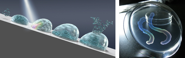 生命進化の歴史において、単細胞から多細胞への進化は重要なイベントですが、その具体的なプロセスはよく分かっていません。本研究では、日本の洞窟の地下河川近傍の壁面から発見された新種細菌HS-3が、新しいタイプの多細胞性を発揮することを明らかにしました。HS-3の細胞集団(コロニーという)は、自己組織化して、液晶のような状態になりました。次に、そのコロニーの中に、小型の細胞を多数収容して、水との接触により小型細胞を放出しました。このようなライフサイクルと多細胞性を示す細菌は過去に報告がありません。より重要なことは、細胞を液晶に似た状態に組織化することで、多細胞性の発現をサポートできることを示したことです。このことは、多細胞化への進化のプロセスに液晶状態が関与するという一つの新しい概念とモデルを与えます。さらに、HS-3の挙動から、洞窟壁面でコロニーが、繰り返し断続的に水流にさらされることが、HS-3の単細胞から多細胞への進化プロセスを培った環境条件であった可能性が示唆されます。これは、動的な環境条件が多細胞性の進化に重要であるとする理論を、現存する生物と環境で支持した、世界で初めてのモデルです。