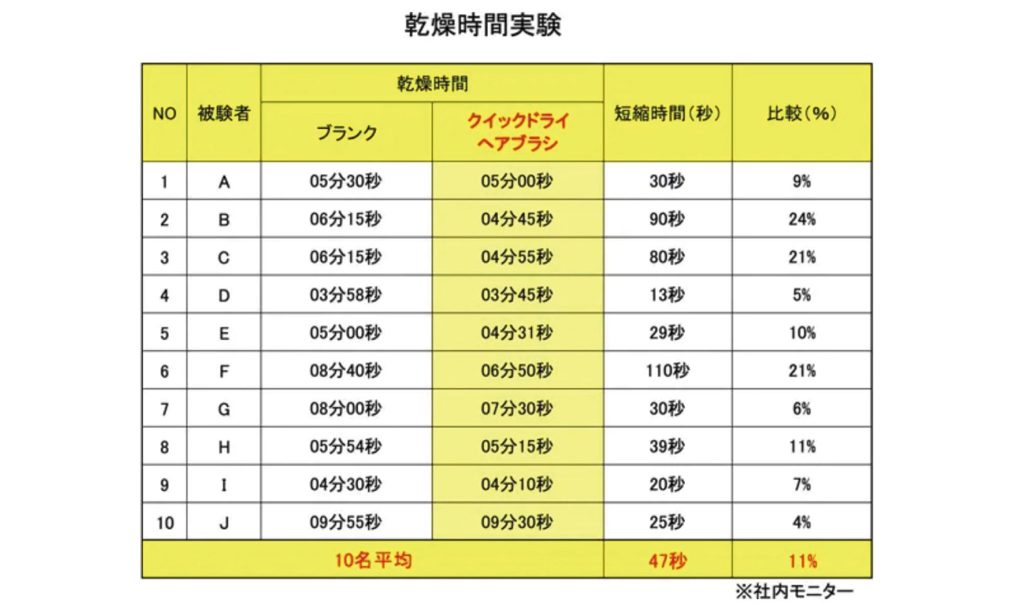 普通のブラシと「クイックドライヘアブラシ」を使って、同じ条件で乾燥するまでのドライヤー時間を計測しました。結果は「クイックドライヘアブラシ」を使用した方が平均47秒早く乾かすことができました。