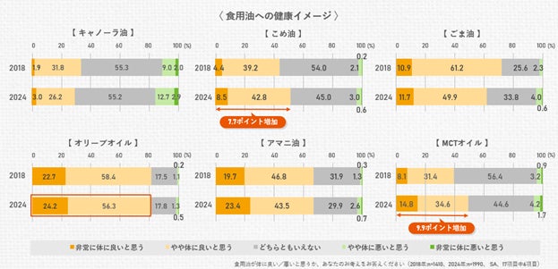 2024年の調査と2018年の同調査を比較した結果、こめ油とMCTオイルに対する健康イメージが向上していることが分かりました。また、健康イメージも背景に使用者が増えているこめ油は、サラダ油やキャノーラ油同様、様々な料理に使用されていることも分かりました。