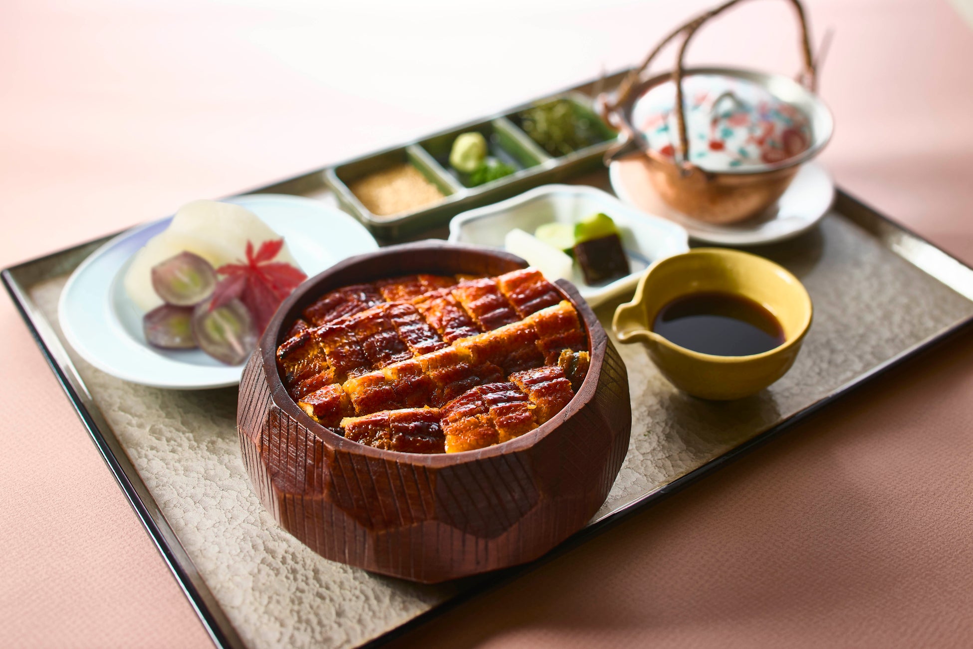 良質な脂がのり、蒸した後の身の柔らかさ、ふっくら感が上品な三河一色産鰻の白焼きを一度蒸してから焼く関東風。蒸した鰻を軽く焼き目がつくまで焼いた後、愛知県の九重みりんを煮詰めて味を調えたタレを塗りながら焼きます。ごはんは魚沼産コシヒカリ。特製のタレと鰹節、鮪節、昆布のすっきりとしたお出汁で味わうひつまぶしをぜひご堪能ください。