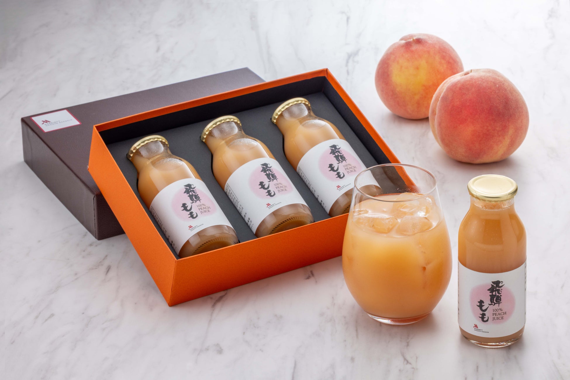 ・飛騨桃100%ジュース 1本(180ml)¥900、1箱(3本入り)¥2,700