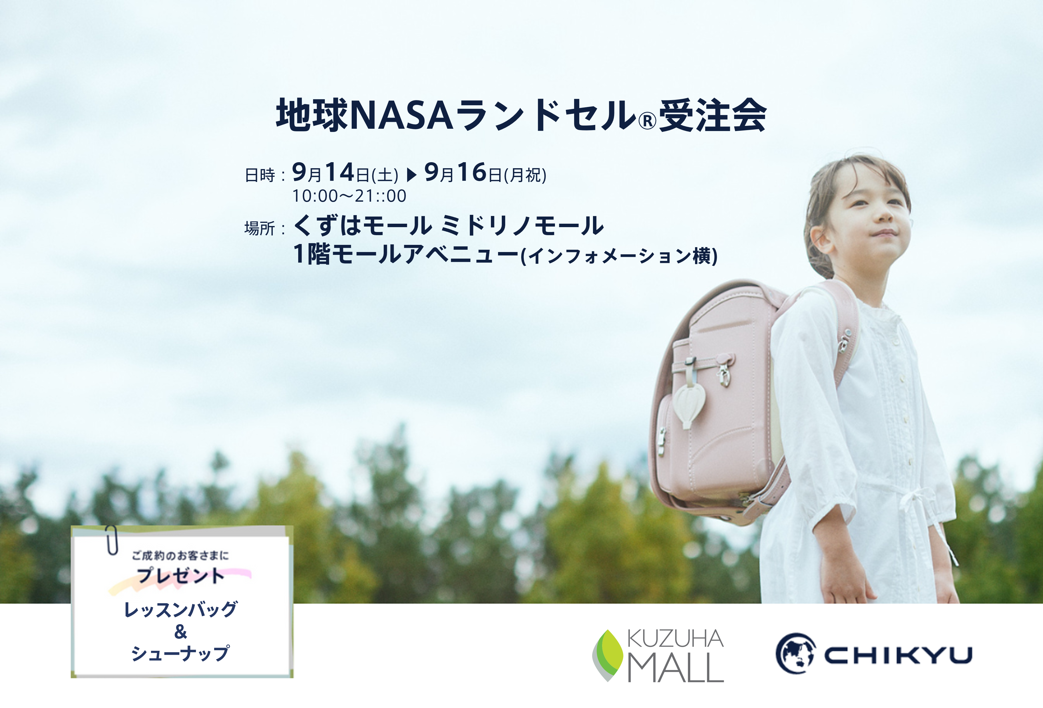 ランドセルの企画・販売を行うCHIKYU株式会社(旧池田地球株式会社、東京都港区、代表取締役:村尾光一)は、大阪・くずはモールにて「地球NASAランドセル® 受注会」を開催いたします。