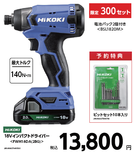 商品名:HiKOKI 18Vインパクトドライバ<FWH18DA(2GBK)>+ 純正ビットセット 10本入り