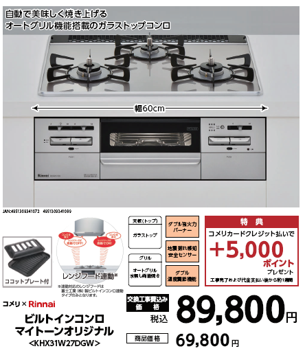 商品名:ビルトインコンロ マイトーンオリジナル<KHX31W27DGW>