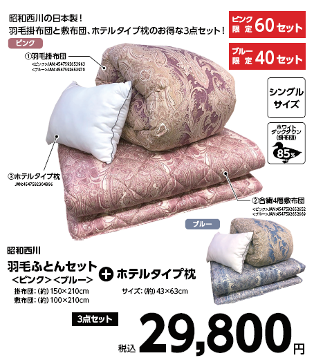 ・羽毛掛布団と敷布団、ホテルタイプの枕のお得な3点セット