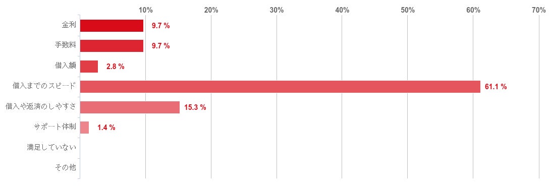 アンケートによれば、最も評価している点には「借入までのスピード」が圧倒的に多く挙げられ、次いで「借入や返済のしやすさ」という結果となった。