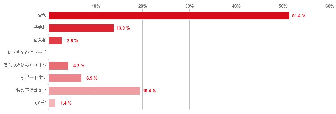 アンケートによれば、「金利」と回答した人が51.4%で最も多い結果となった。他社と比較してより低い金利を求める人からの意見が寄せられていると考えられる。