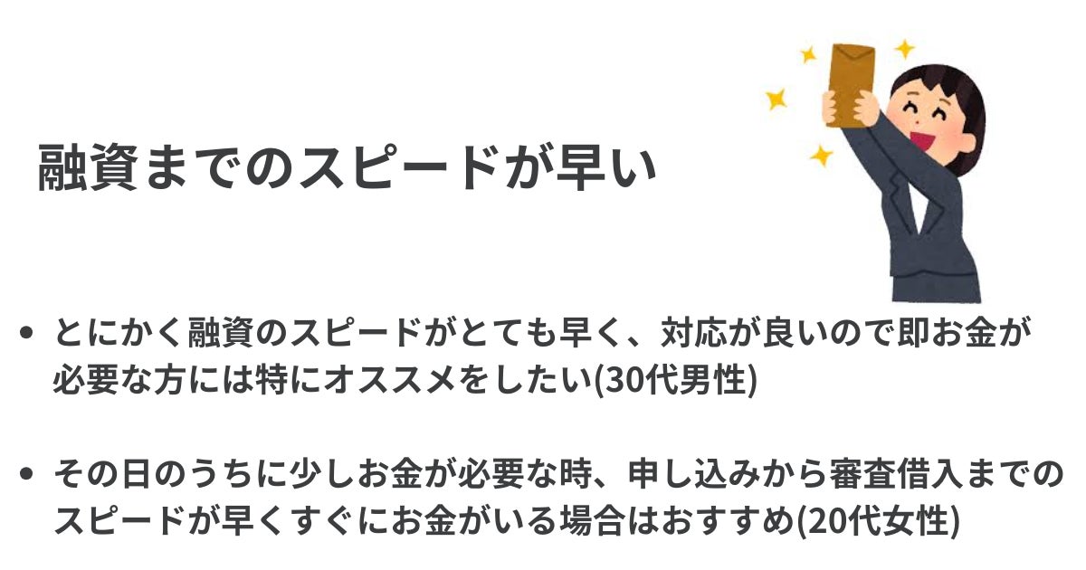 先述の通り即日融資も可能であるため、借入までのスピードについて満足と感じている人が多い結果となっているようだ。