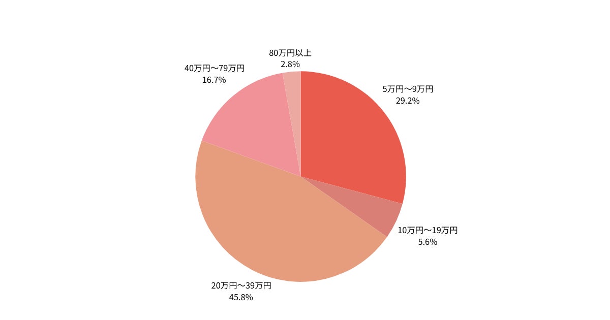 アンケートによると、少額~中額借入(5万円~39万円)をしている人が全体の8割以上を占める結果となり、反対に80万円以上借りたという回答は2件のみであった。