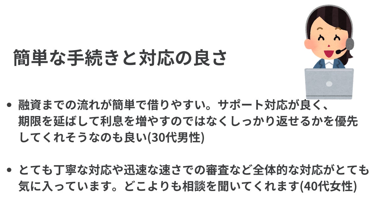 アンケートによれば、サポート体制についても借入までのスピード、借入や返済手続きの利便性と同じように概ね高い評価が集まる結果となった。
