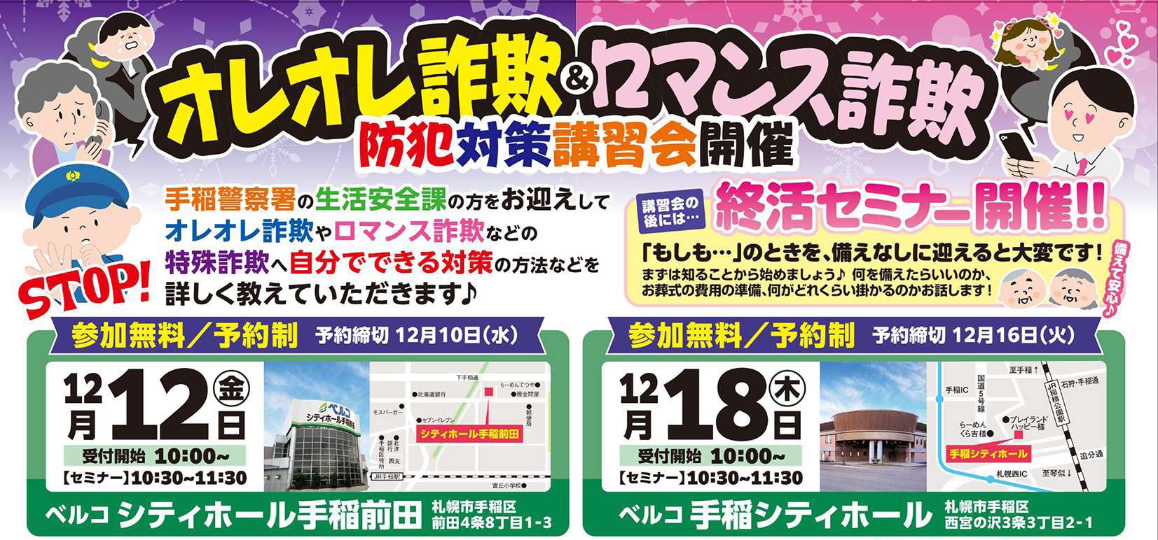 「オレオレ詐欺・ロマンス詐欺 防犯対策講習会」12月12日・18日に札幌市手稲区で開催