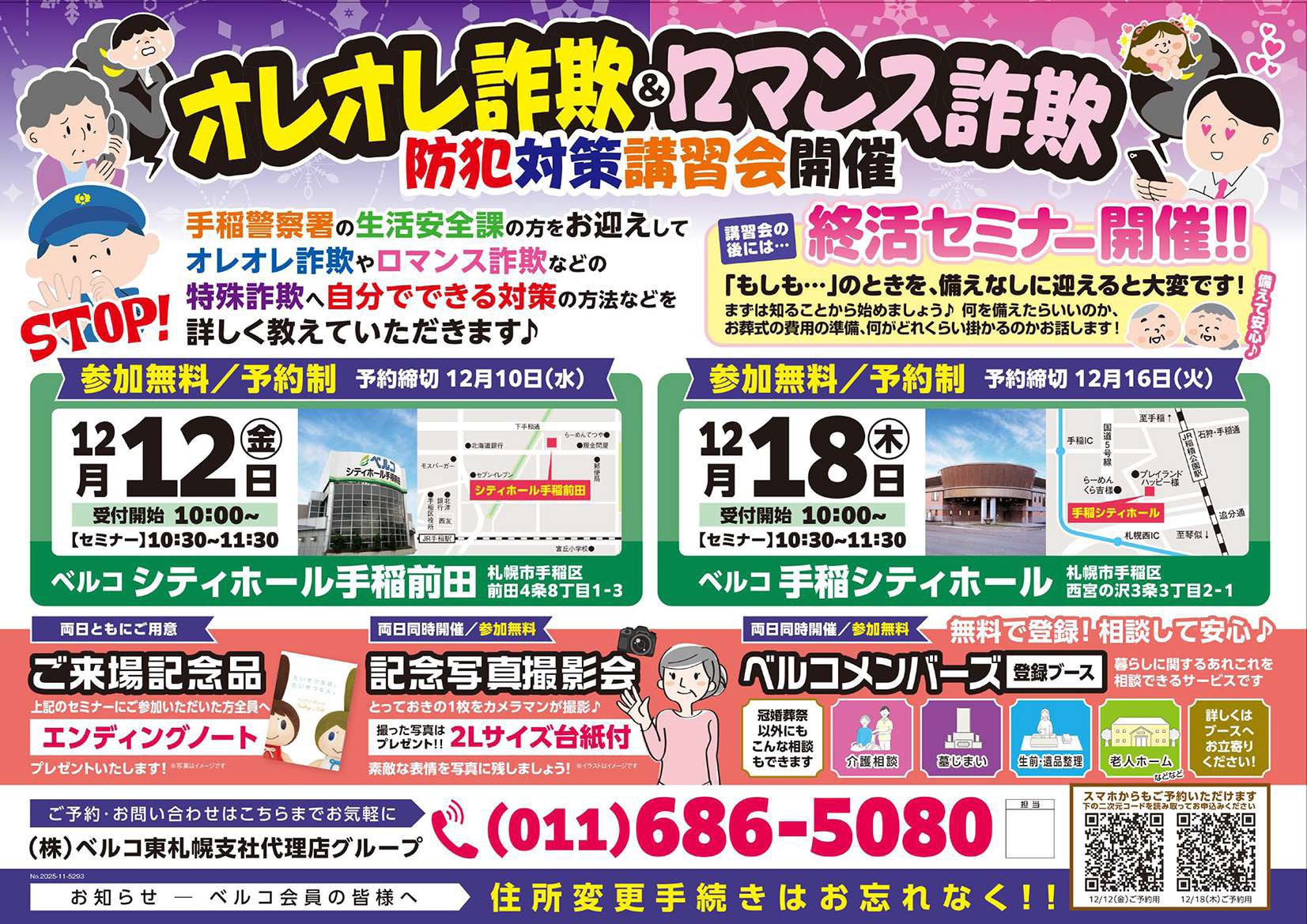 株式会社ベルコ 東札幌支社(札幌市手稲区)は、地域の安心安全な暮らしを支援する取り組みとして、2025年12月12日(金)および12月18日(木)の2日間に、「オレオレ詐欺・ロマンス詐欺 防犯対策講習会」を開催します。手稲警察署 生活安全課の担当者を講師に招き、実際に多発している詐欺の最新手口や、自分でできる防犯対策について具体的に解説します。