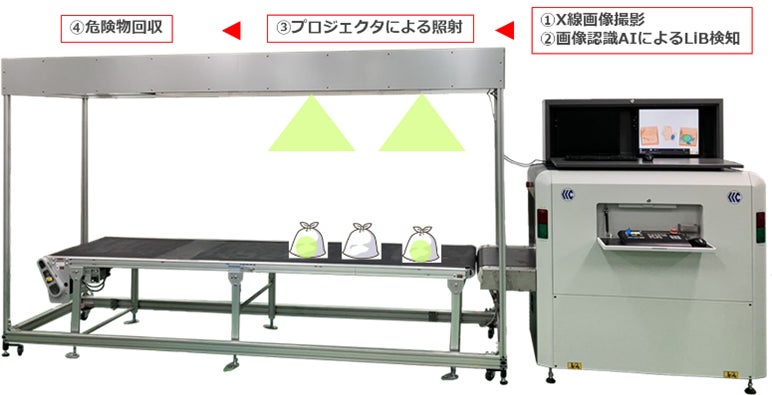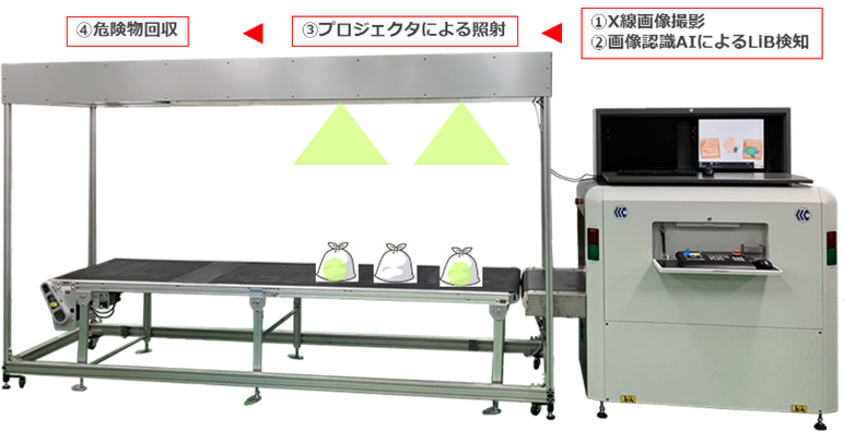 実証実験を行う検知システムは,コンベヤを流れる燃やせないごみをX線で撮影し,その画像からAIシステムがリチウムイオン電池を検出します。検出した位置を,プロジェクションマッピングを用いて作業者に通知し、作業員がリチウムイオン電池等を取り除きます。 今回の実験では,行政収集された燃やせないごみの中から,様々な形状をした電池等を検出する精度や作業性の向上などを確認し,検知システムの効果を検証します。