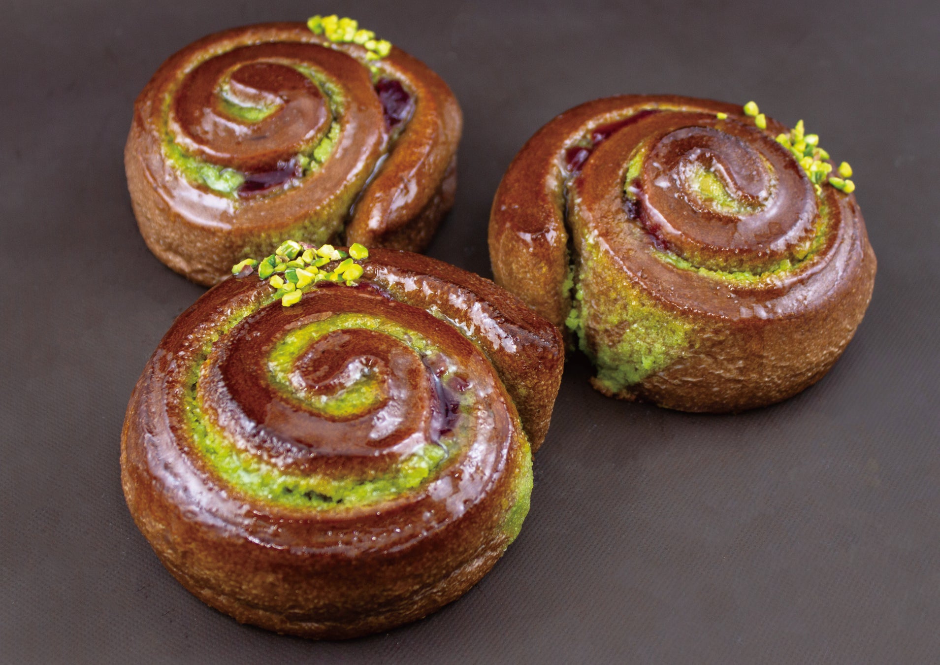 フランス産カカオパウダーを練り込んだ生地に、ピスタチオアマンドとフランボワーズジャムを巻き込み焼き上げました。カカオの香る生地に、香ばしいピスタチオ、フランボワーズの甘酸っぱい風味が合わさり、特別感あふれる一品となっております。