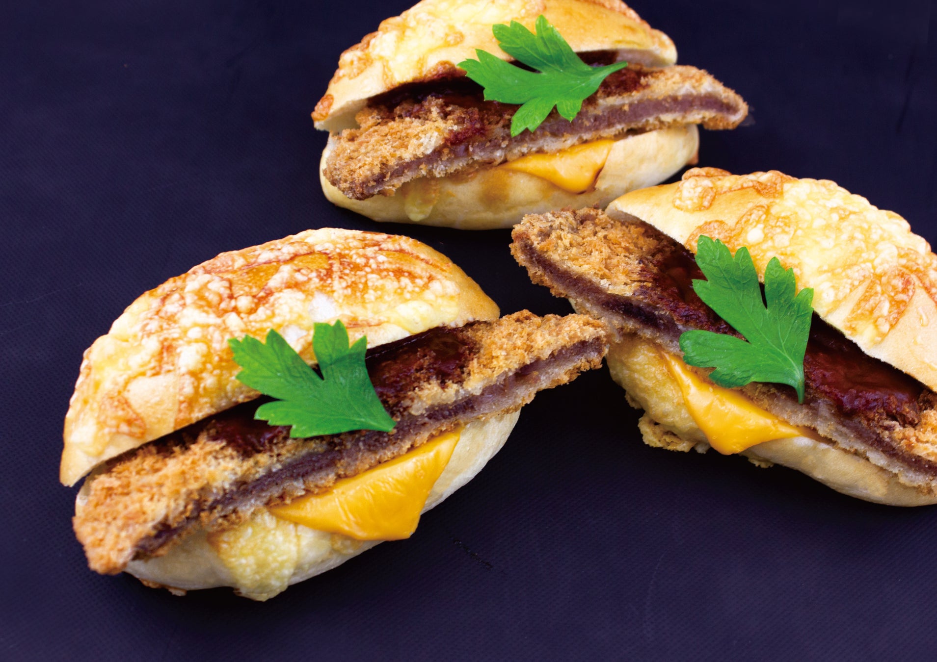 デミグラスソースとビフカツをサンドし焼き上げました。みんな大好きカツサンド!ソースのコクとチーズの風味が溶け合う、ジューシーな美味しさをお楽しみください。