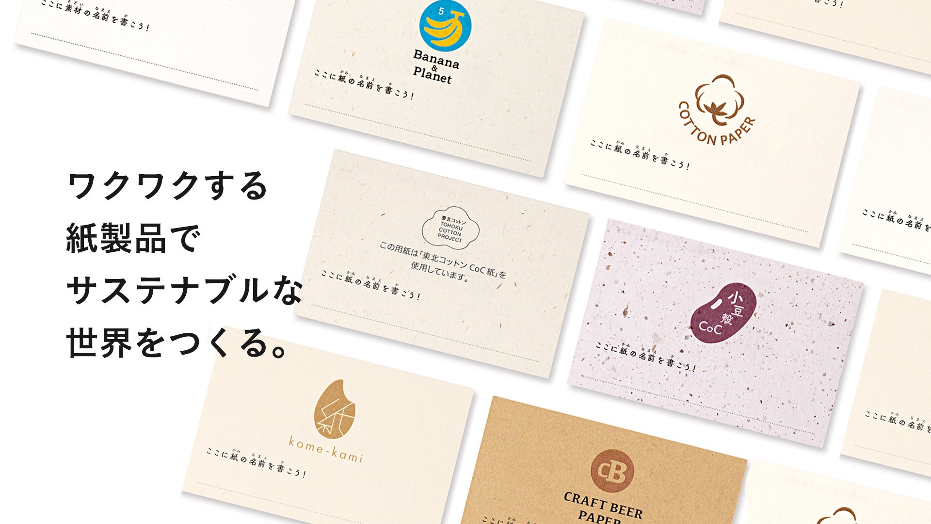 KAMIKENでは「サステナブル紙を使ってもらう」ことで、紙への関心を高め、選んで使うという未来を育てたいと考えています。そのため、ある程度認知度がある/または認知度を広げる取り組みをしている用紙を積極的に活用しています。
