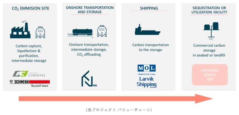 当プロジェクトは、当社、当社が出資するノルウェーの船舶管理会社Larvik Shipping AS(本社:ノルウェー・ラルビック、以下「LS社」)(註2)、リトアニアの国営ターミナルオペレーターKN Energies, AB(本社:リトアニア・クライペダ、以下「KN社」)、同国のセメントメーカーAkmenės cementas AB(本社:リトアニア・アクメネ、以下「Akmenės社」)およびラトビアの建築資材メーカーSCHWENK Latvija SIA(本社:ラトビア・リガ、以下「SCHWENK社」)の計5社で構成されるCCS Baltic Consortium(以下「当コンソーシアム」)が手がけるものです。